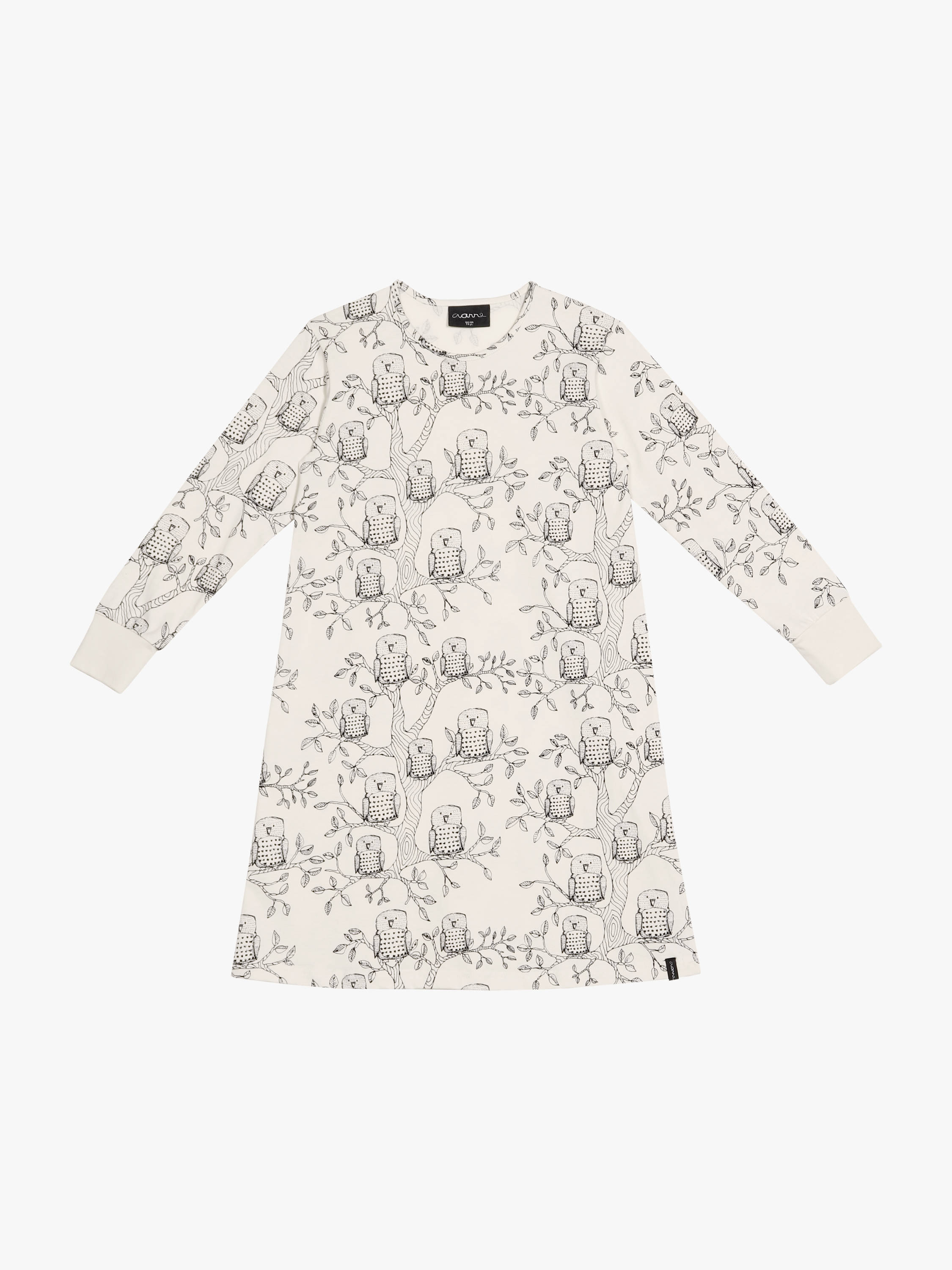 Shane on pitkähihainen yöpaita, jossa on rento ja mukava mitoitus. Hihansuissa reilun mittainen resori, joka on mukava ja helppo kääntää hihojen ollessa vielä pitkät. Kääntömahdollisuus pidentää myös yöpaidan käyttöikää. Korkealaatuisen kankaan pohjaväri on luonnonvalkoinen ja Pöllö -printti on musta.