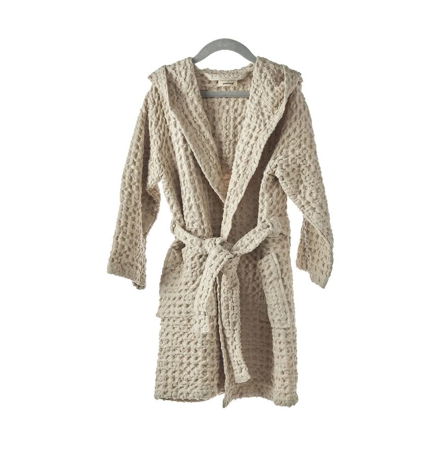 Suloista lasten kylpytakkia koristaa huppu, jossa on pitkät pupunkorvat. Pupu-kylpytakki on pestystä luomupuuvillaisesta vohvelikankaasta valmistettu ja se on kevyen ja mukavan tuntuinen ihoa vasten.