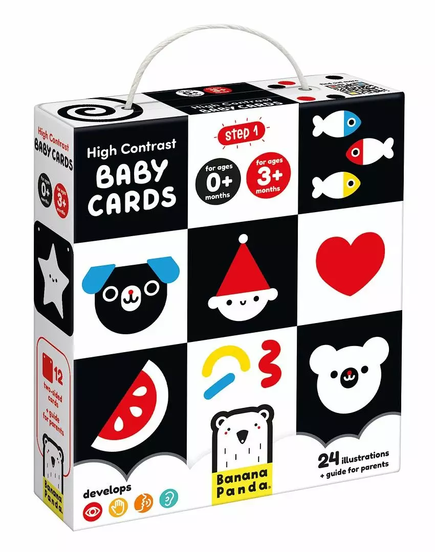 12 kaksipuolista korttia, joiden yksinkertaiset voimakaskontrastiset kuvat ilahduttavat vauvoja ensikuukausista alkaen. Korttien koko 16 x 16 cm, voidaan kiinnittää toisiinsa selailtavaksi kirjaksi.