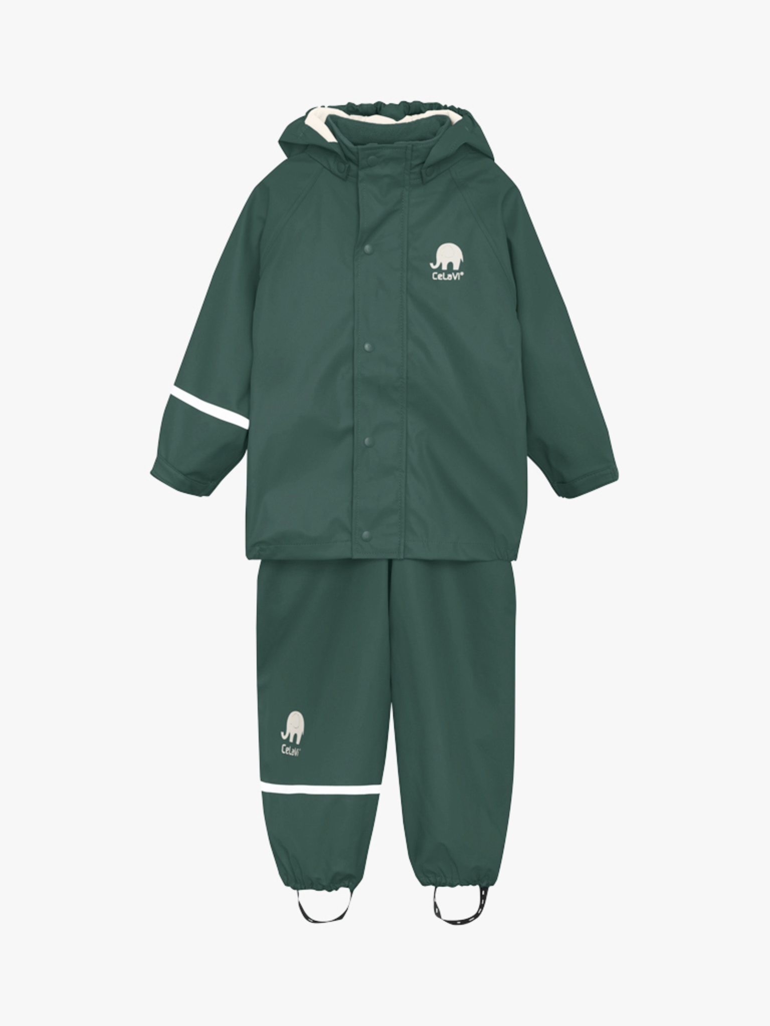 Tanskalaisen CeLaVi:n laadukas tummanvihreä (ponderosa pine) sadeasu, joka pitää sisällää housut ja takin. Takissa vetoketju, housuissa jalkalenkit. Housuissa korkea henkselimalli koossa 90 ja 100. Housut vyötärömalliset koossa 110 ja 120.