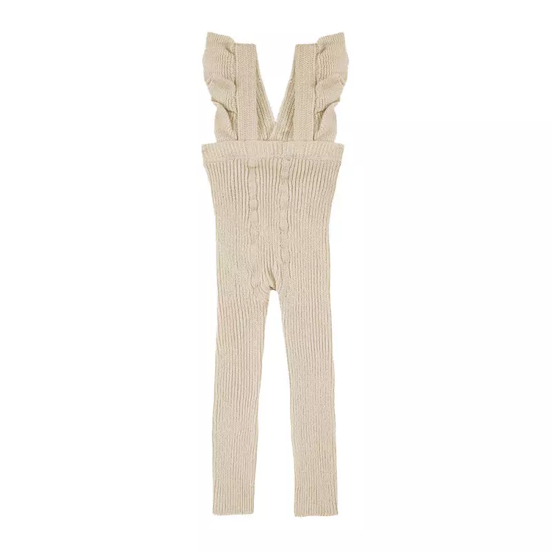 Vauvojen ja taaperoiden suloiset leggarit kauniilla frilla-henkseleillä. Mukavaa ja pehmeää rib neulosta.
