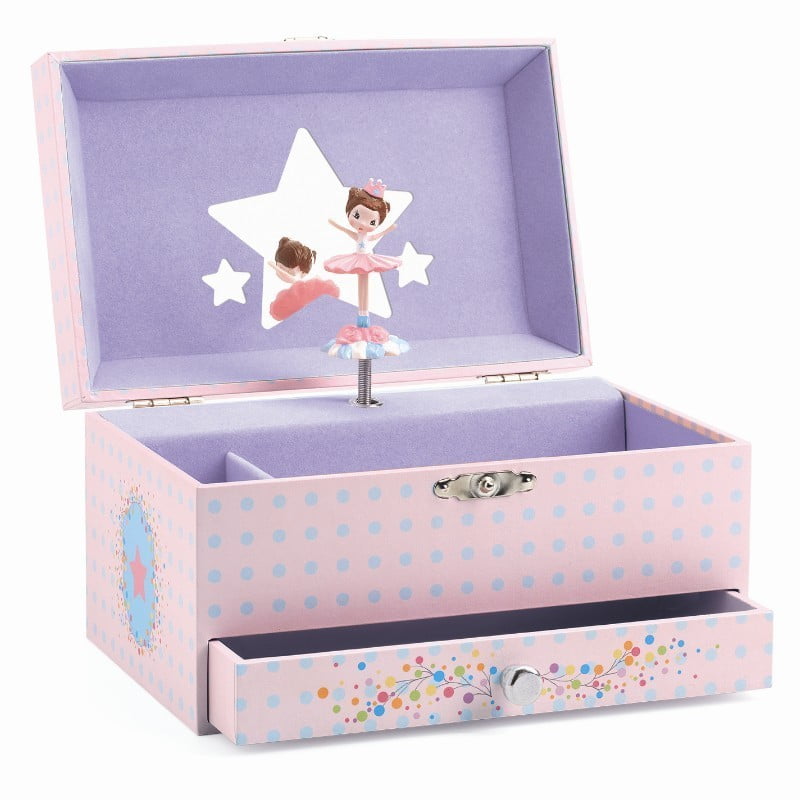 Hempeä, mekaaninen ballerina soittorasia. Musiikki alkaa soimaan, kun kansi avataan ja ballerina pyörii peilin edessä. Soittorasiassa on vetolaatikko ja sisäpuolella on tila sormuksille.... Lue lisää