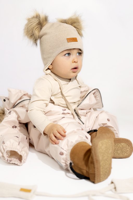 Merinovillapipo vauvoille kahdella tekoturkistupsulla. Sivuilla nauhat. Tekonahasta valmistettu logo pipon etuosassa.