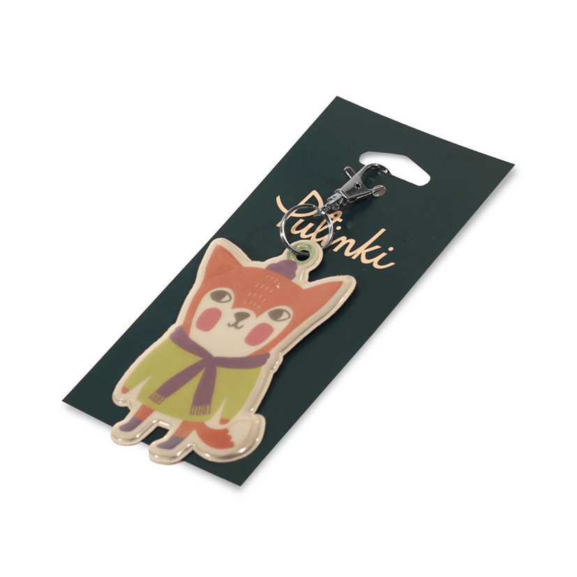Suomalainen design heijastin ketun kuvalla. Sisältää papukaijalukon ja palloketjun.