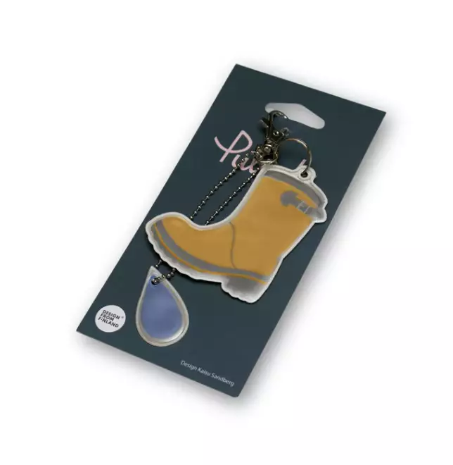 Suomalainen design heijastin keltaisen kumisaappaan kuvalla. Sisältää papukaijalukon ja palloketjun. Heijastin on CE (EN 13356)-merkitty. Tyyppitarkistettu, heijastin täyttää EU:n henkilönsuojainasetuksen 2016/425. Sisältää pieniä osia, ei sovellu alle 3-vuotiaille. Koko n. : 7,5 x 10 cm. Palloketju: 7 cm. Design: Kaisu Sandberg. Valmistettu Suomessa.