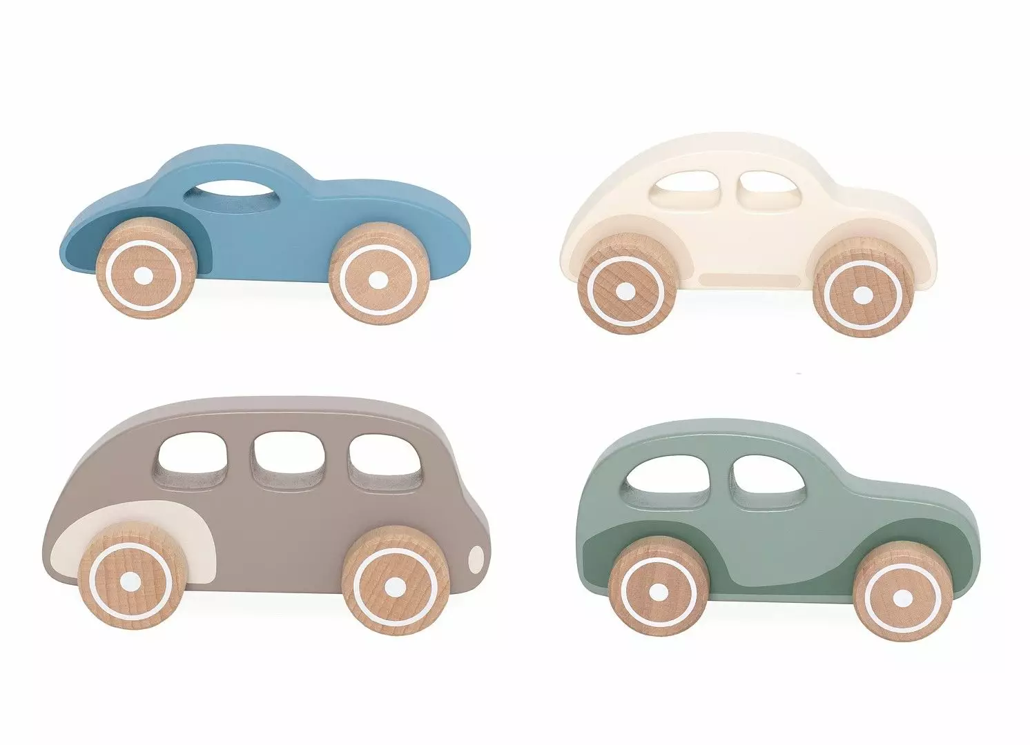 Kauniit puiset autot. Ikkunoiden rei'istä saa hyvin kiinni ja autoja on helppo liikutella. Autojen pituus n. 14 cm. Ikäsuositus: 1+.