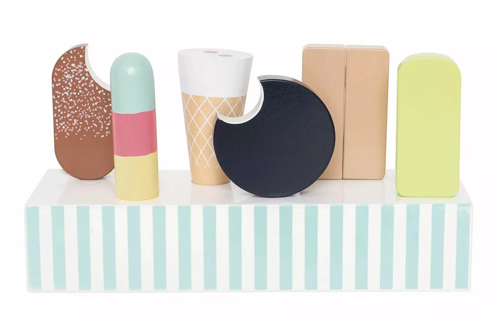 Valitse suosikkisi kuudesta herkullisesta jäätelöstä. Puisia jäätelöitä vaikkapa kioskileikkiin. Puisen telineen koko 25x8 cm. Pakkauksen koko 15x26x10 cm. Ikäsuositus: 2+.