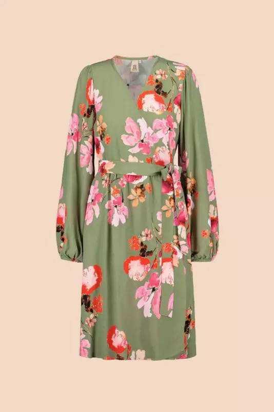 Cherry Blossom -kuosin murrettua vaaleanvihreää pohjaa koristaa suuret kirsikankukat. Laadukas naisten Wrap Mini -mekko on suunniteltu ja valmistettu kestämään käytössä vuodesta toiseen.