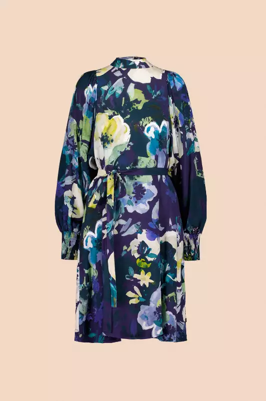 Näyttävä naisten mekko on leikkaukseltaan kepeän A-linjainen. Harkituissa yksityiskohdissa yhdistyvät suuret volyymihihat ja rannekkeiden kaunis smock-rypytys. Elegantissa pystykauluksessa on selkäpuolella päällystetyt napit ja pieni halkio. Mekon mukana tuleva irtovyö mahdollistaa vyötärön korostamisen.