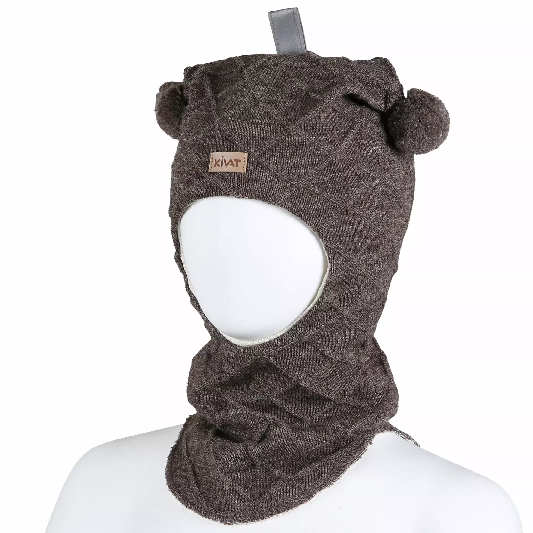 KIVAT-villakypärämyssy. Kypärämyssyssä on kaunis kohopintainen kaapelineulos, pallotupsut ja näkyvyyttä lisäävä heijastinnauhalenkki.