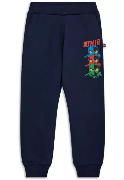 Lasten tummansiniset collegehousut joissa värikäs Ninjago -painatus vasemman reiden kohdalla. Resorit lahkeensuissa, kuminauha-nappikiristys vyötäröllä.