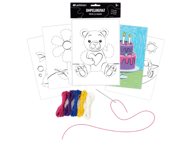 Väritä ja ompele! Perinteiset kartonkiset ompelukuvat voi myös värittää. Leikkien Ompelukuvat -askartelusetti sisältää viisi väritettävää ompelukuvaa, viisi eriväristä puuvillalankaa ja tylpän kanavaneulan.
