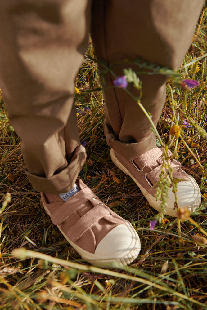 Kim canvas shoe, pale tuscany. 100% cotton canvas upper. Velro straps on upper. Extra protection in rubber on both toecap and heelcap. monogram rubber patch at heelcap.