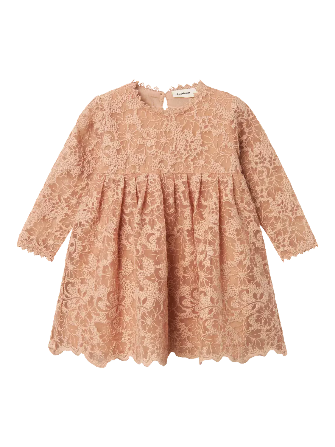 Lasten aprikoosinvärinen pitsinen juhlamekko. 71% luomupuuvillaa, 29% nailonia