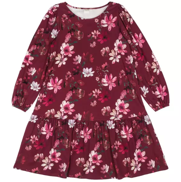 Tummanpunainen pitkähihainen A-linjainen mekko on valmistettu joustavasta puuvilla-modaalisekoitteesta. Mekossa on pyöreä pääntie, runsas helma ja ihastuttavasti asettuvat hihat rypytettyine hihansuineen. Aikuisten mekossa hurmaa ihana Talvipuutarha-kuosi.