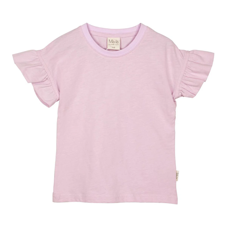 Laventelinliila lasten t-paita, joka on pehmeää ja eläväpintaista slub-puuvillaa. Paidassa on laskettu olkalinja, suora malli ja tuplafrillalla viimeistellyt hihansuut.