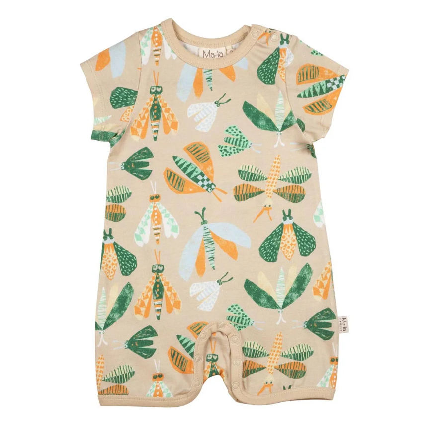 Lämpöisen beige vauvojen lyhythihainen leikkipuku, jossa on lyhyet lahkeet. Hellepuvun pehmeän beigellä pohjalla on akvarellimainen Öttiäiset-kuosi.