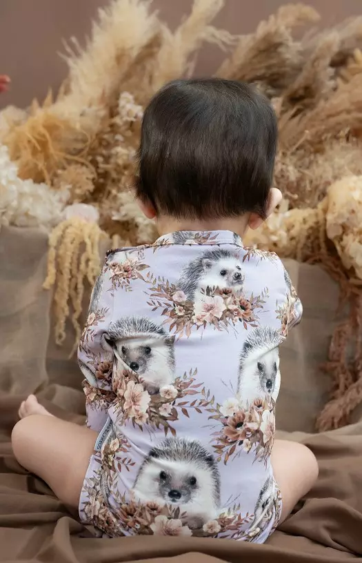 Suloinen kotimainen vauvan body kauniilla siili kuviolla.