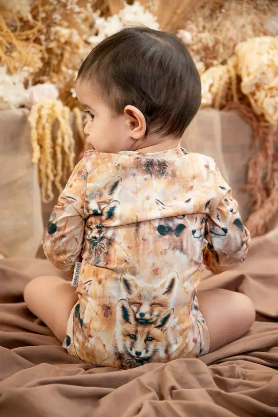 Suloinen kotimainen vauvan body kauniilla kettu kuosilla.