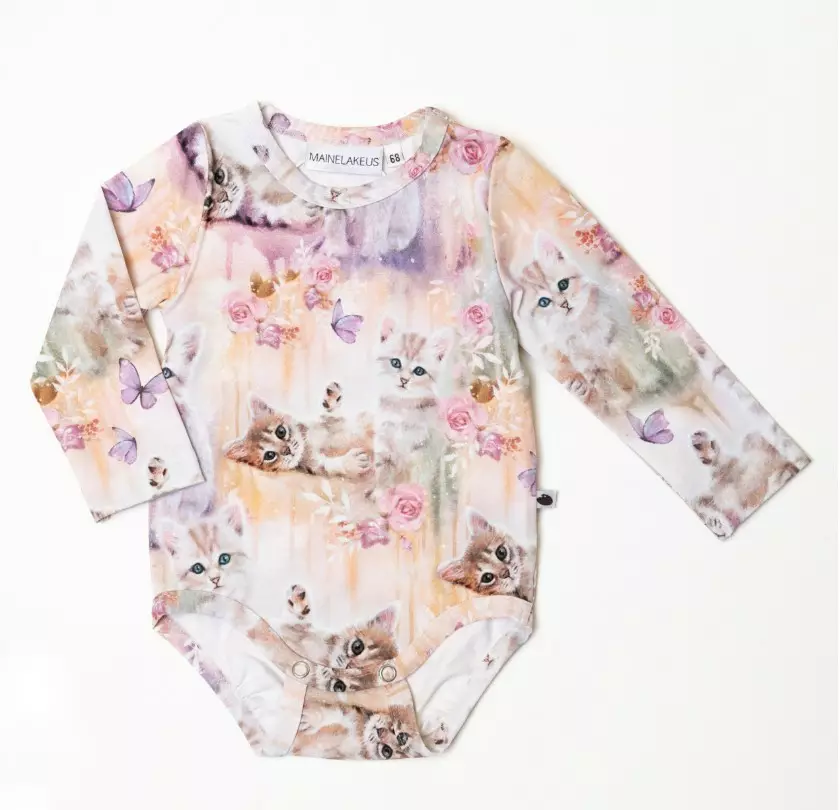 Suloinen kotimainen vauvan body kauniilla kissa kuviolla.