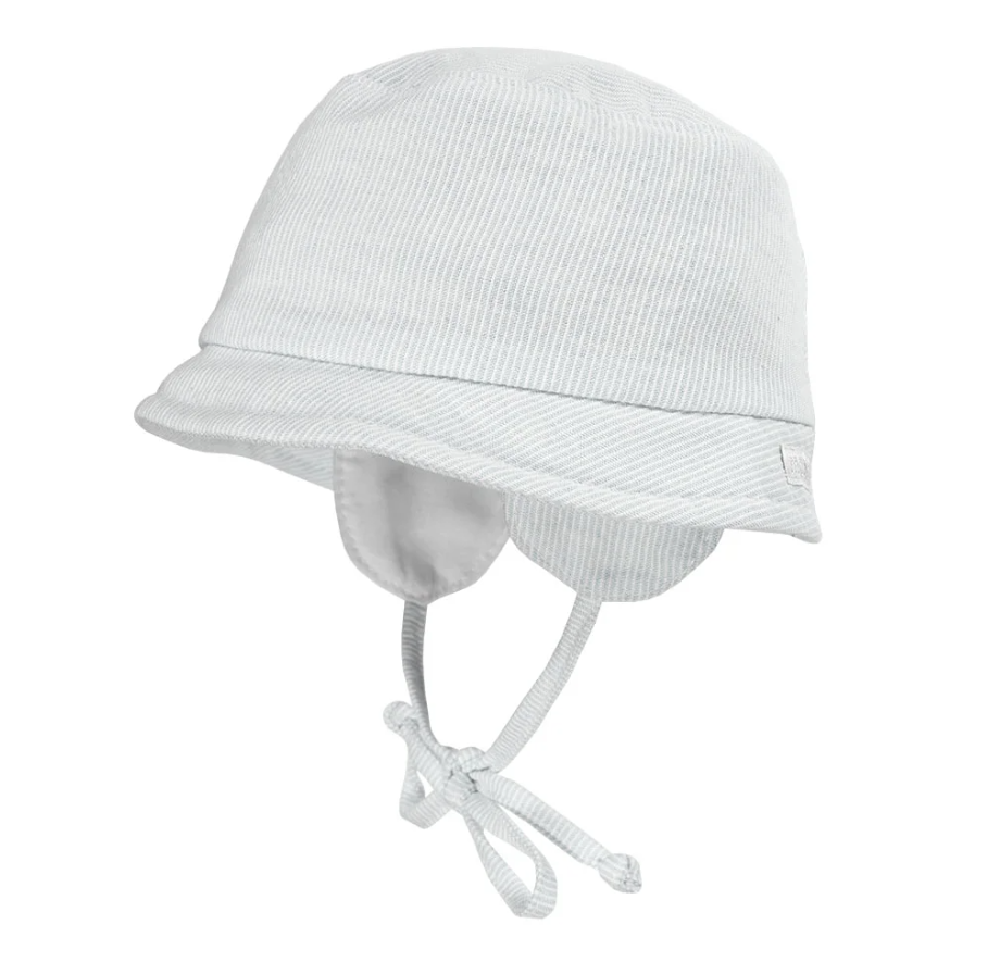 Vauvan kesähattu korvaläpillä ja nauhoilla. Hatun takaosassa trikookaistale, joten hattu asettuu hyvin ja istuvasti vauvan päähän ja mukautuu pehmeästi pään muotoon.