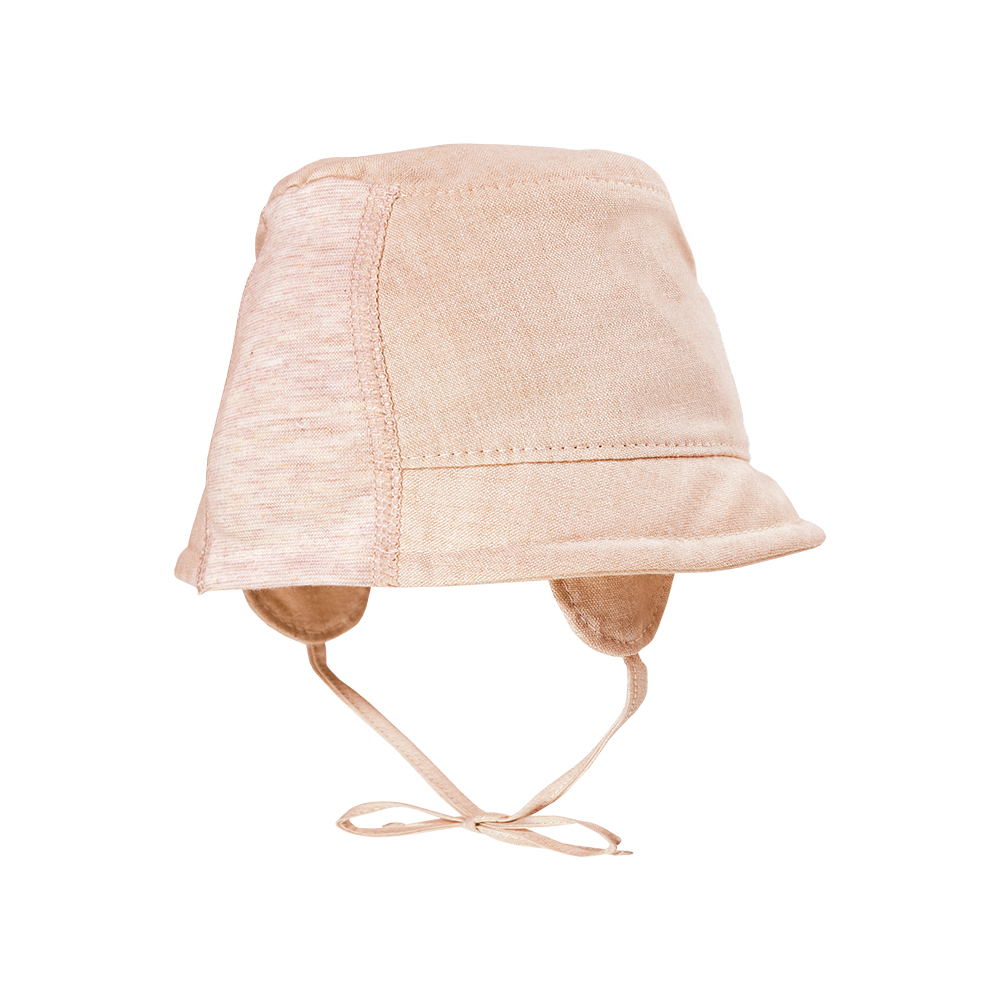 Vauvan kesähattu korvaläpillä ja nauhoilla. Hatun takaosassa trikookaistale, joten hattu asettuu hyvin ja istuvasti vauvan päähän ja mukautuu pehmeästi pään muotoon.