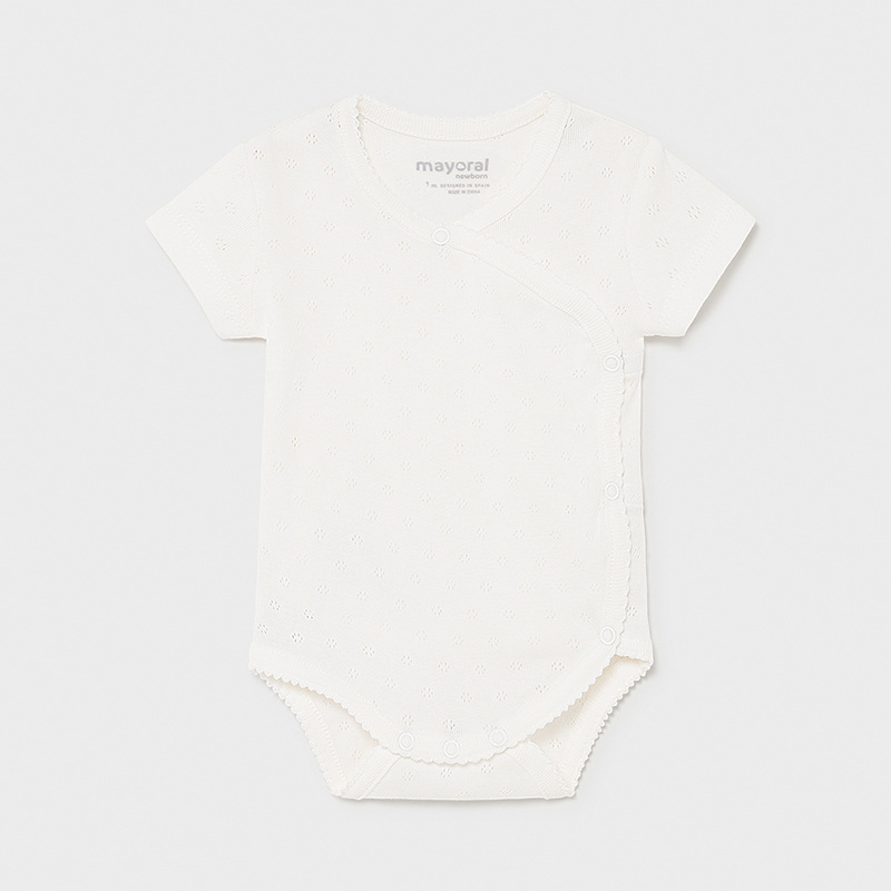 Mayoral vauvan lyhythihainen kietaisubody. Luonnonvalkoinen, neulos ns. pitsikuvioinen.