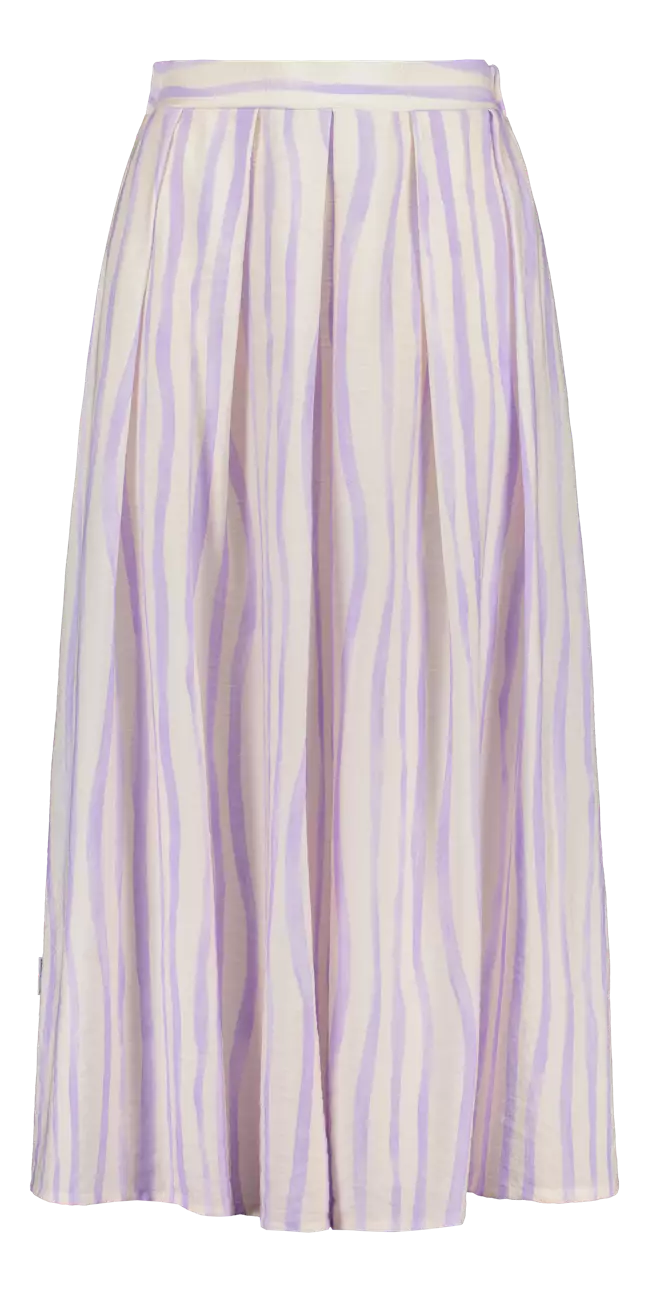 Alley Lily - sävyinen pitkä hame yhdistää klassisen siluetin ja modernin kuosin, jossa vesivärein maalattu aaltoileva raita tuo graafista ilmettä asuusi. Tämä midimittainen viskoosihame laskeutuu kauniisti ja tuntuu iholla kevyeltä ja ilmavalta. Viskoosin lisäksi materiaalissa on polyamidia, mikä vähentää kutistumista ja tekee kankaasta kestävämmän. Vyötäröllä on edessä kauniit laskokset ja takana joustava kuminauha, joka takaa miellyttävän istuvuuden ja monikäyttöisyyden – yhdistä vaikka rentoon puuvillaneuleeseen.
