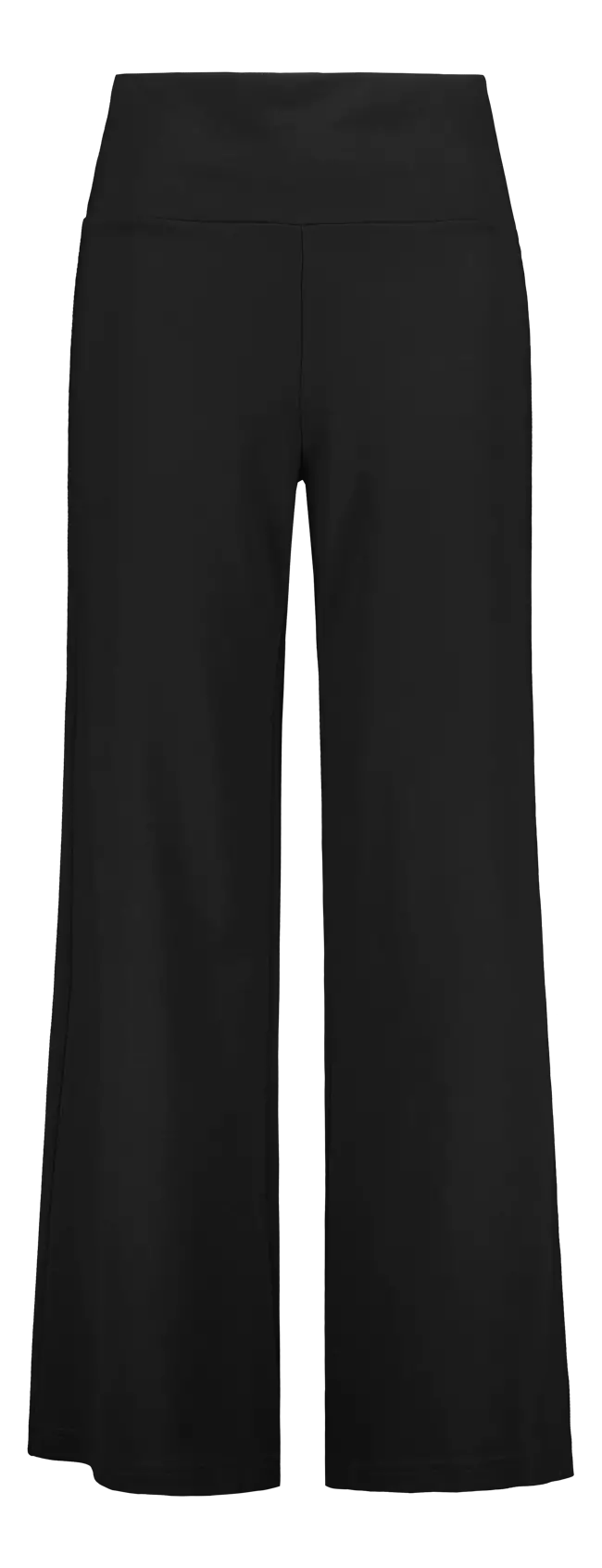Mustat leveälahkeiset housut ovat klassiset ja monikäyttöiset. Korkeavyötäröiset housut on valmistettu napakasta (ponto roma) trikoosta, joka on materiaalina mukavan joustavaa mutta kestävää. Trikoohousuissa ei ole taskuja ja vyötärökaitale on korkea, joten sen voi pitää suorana tai halutessaan kääntää alas.