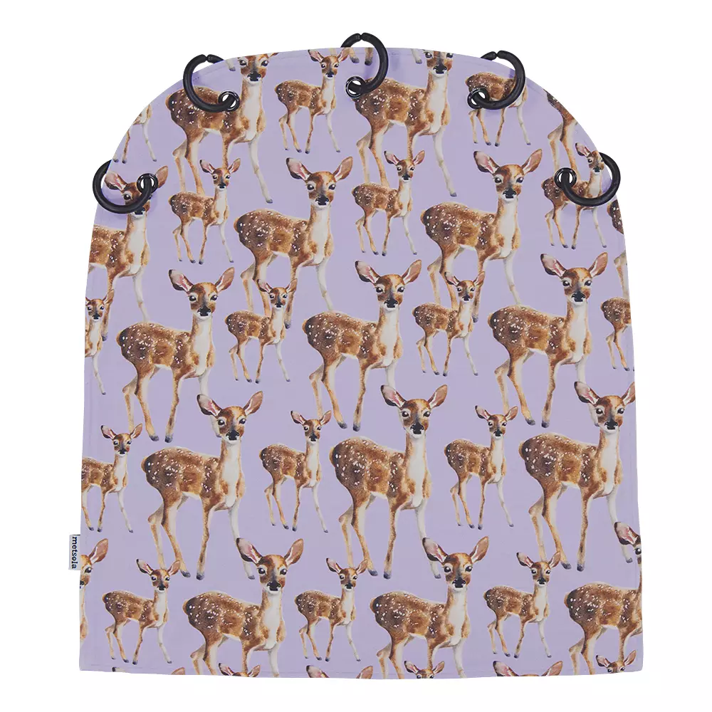 Tämä pehmeä luomupuuvillasta valmistettu vaunuverho luo vauvallesi rauhallisen ja suojaisan ympäristön, suojaten häntä tuulelta ja häiriöiltä, mutta sallien ilman kiertää vaunuissa vapaasti. Kaksipuoleinen printti varmistaa, että ihastuttava bambi näkyy kauniisti kaikista suunnista. Viisi irrotettavaa monitoimirengasta tekevät kiinnityksestä helppoa ja joustavaa – sopii useimpiin vaunukoppiin! Vaikka kankaassa ei ole UV-suojaa, se luo miellyttävän suojan pienelle matkustajalle.