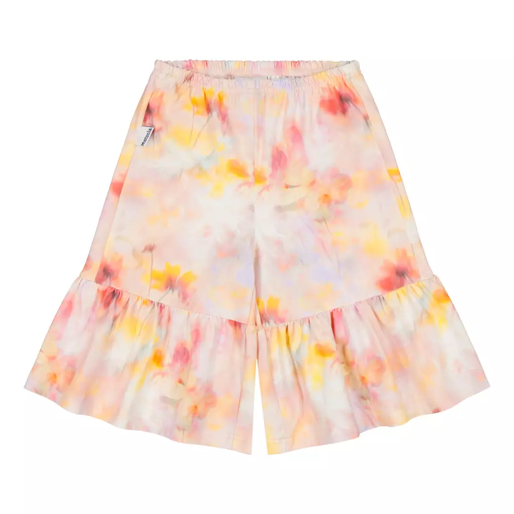 Rento kuminauhavyötärö takaa hyvän istuvuuden, ja housujen erikoisuus löytyy lahkeista: näyttävät röyhelöt lahkeensuissa tuovat ripauksen leikkisyyttä ja persoonallista tyyliä. Herkkä ja abstrakti Pastel Dance -kuosi viimeistelee kokonaisuuden taianomaisella tunnelmalla.