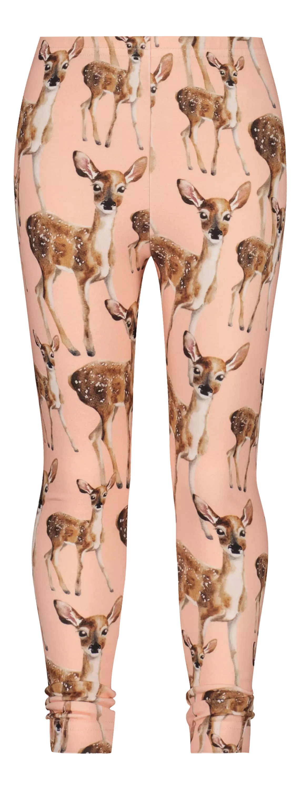 Housuissa nähdään Henna Adelin suunnittelema Bambi-kuosi, nyt uudessa, heleän persikkaisessa Peachy-sävyssä. Kuosin pehmeä ja rauhallinen ilme tekee leggingseistä helposti yhdisteltävän osan lapsen vaatekaappia.