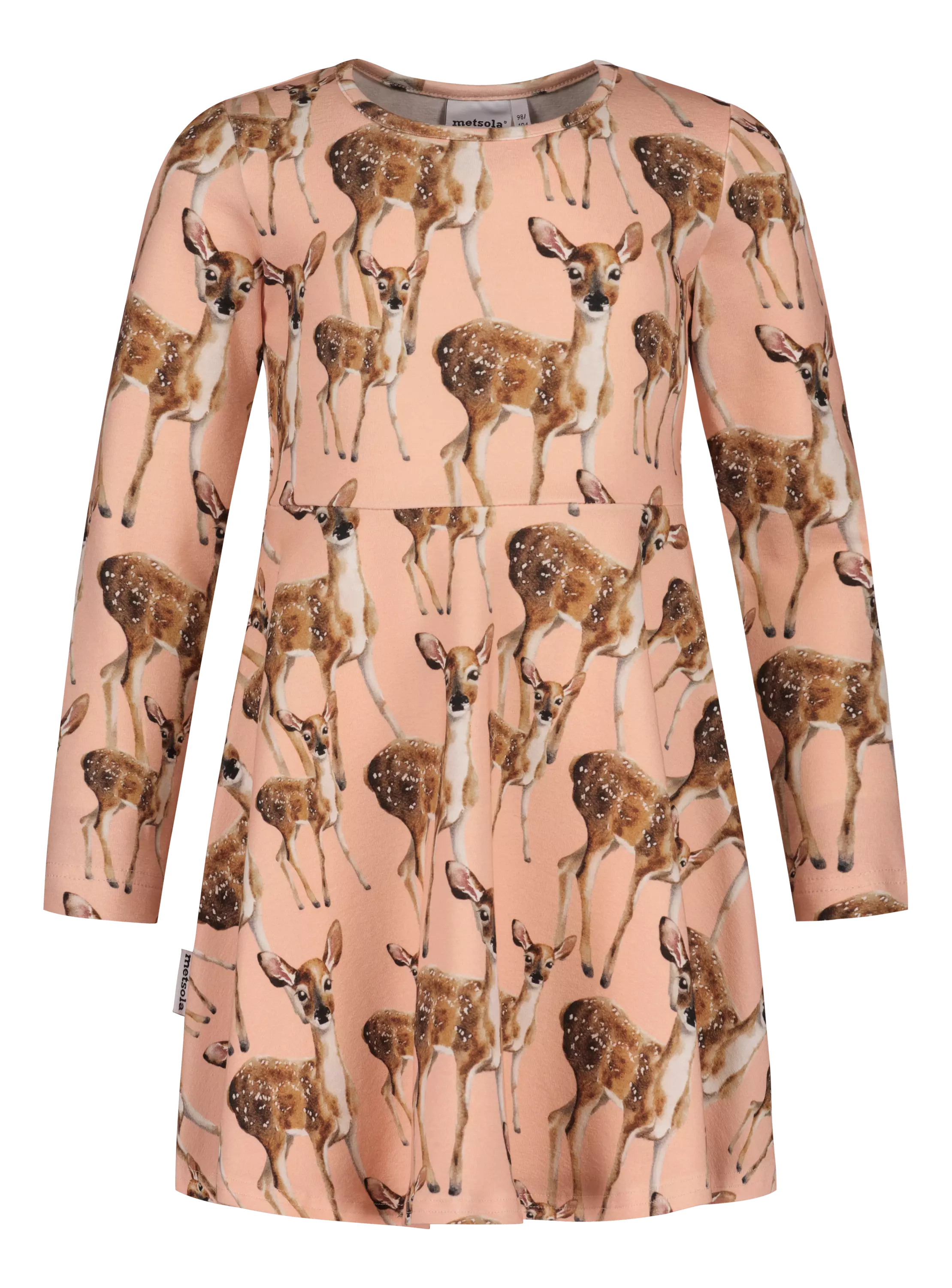 Tätä lasten mekkoa koristaa Henna Adelin rakastettu Bambi-kuosi, jossa suloiset hahmot asettuvat pehmeän persikkaiselle Peachy-taustalle. Kuosin tunnelma on lämmin ja helposti lähestyttävä - täydellinen valinta arkeen tai pieniin juhlahetkiin.