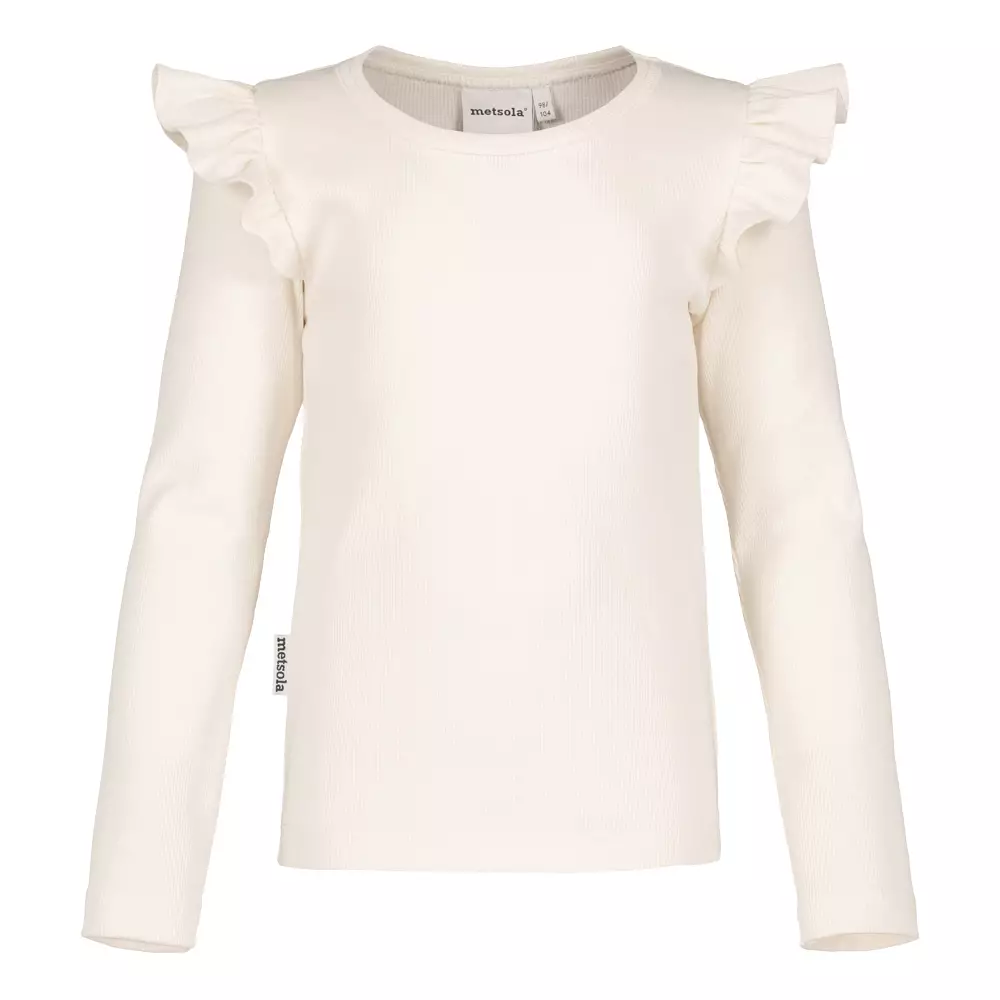 Tämä lasten paita on valmistettu pehmeästä luomupuuvillasta. Pitkähihainen lasten paita on materiaaliltaan kestävää ja joustavaa rib-kangasta. Paitaa koristavat ihanat frilla hihat ja neutraali sävy sopii osaksi juhlavaa pukeutumista.