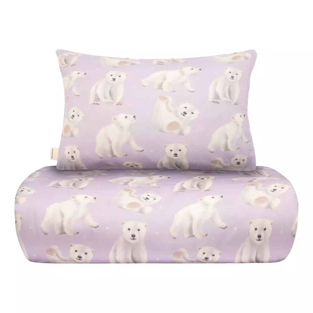 Polar Bears -Pussilakanasetti junior-koko, väri Icy Lilac kietoo lapsen uniin talven taian ja pehmeyden. Henna Adelin piirtämät jääkarhunpoikaset leikkivät hiljaisessa lumisateessa, jonka Icy Lilac -sävy tekee pussilakanoista visuaalisesti rauhalliset ja hurmaavat.