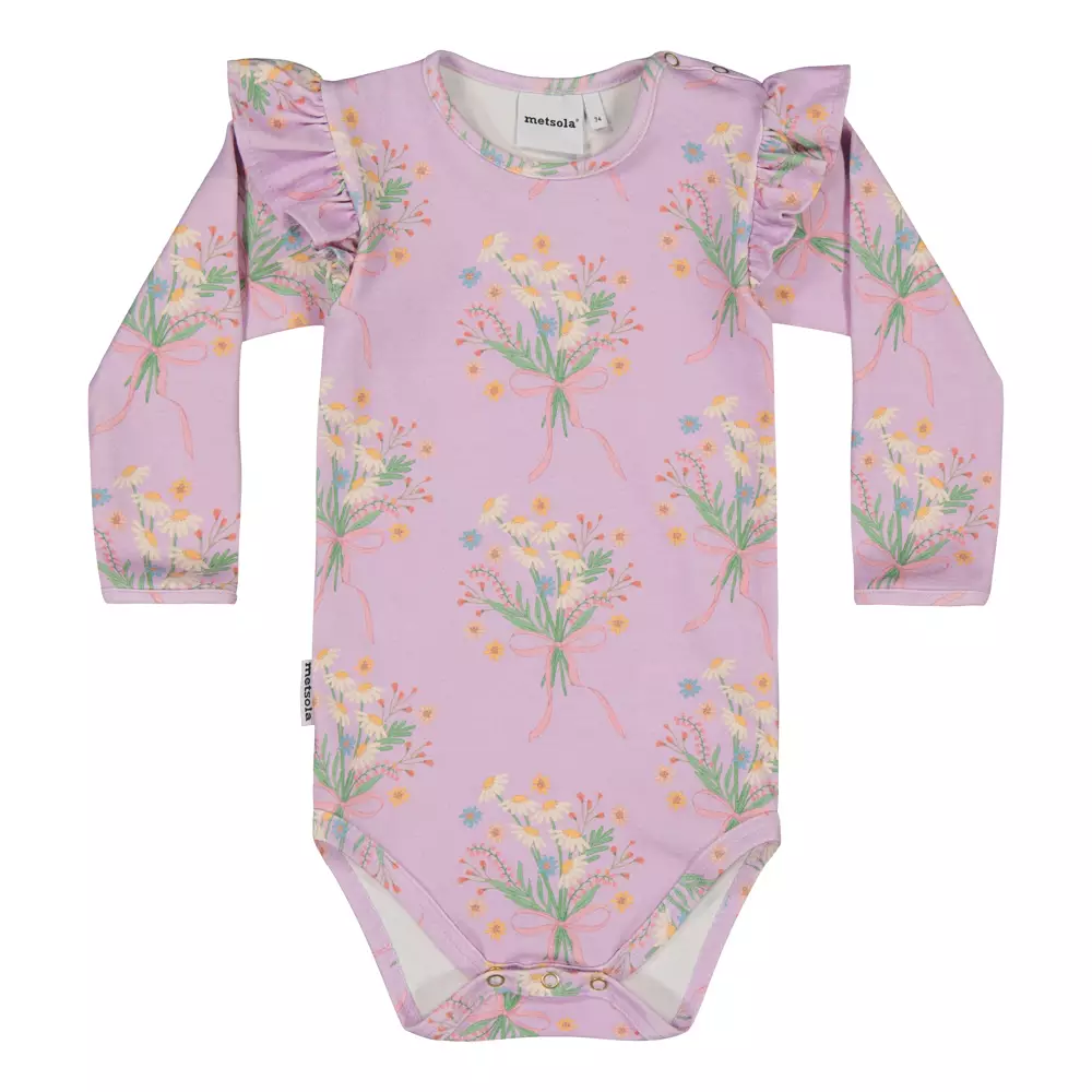 Special Day Frilla -body on suloinen arjen ilopilkku, jossa leikkisyys ja käytännöllisyys yhdistyvät. Bodyssa hehkuu Veera Grönbergin suunnittelema Special Day -kuosi, jossa värikkäät niittykukat levittäytyvät laventelinliilalle taustalle - kuin pieni juhla puettuna.