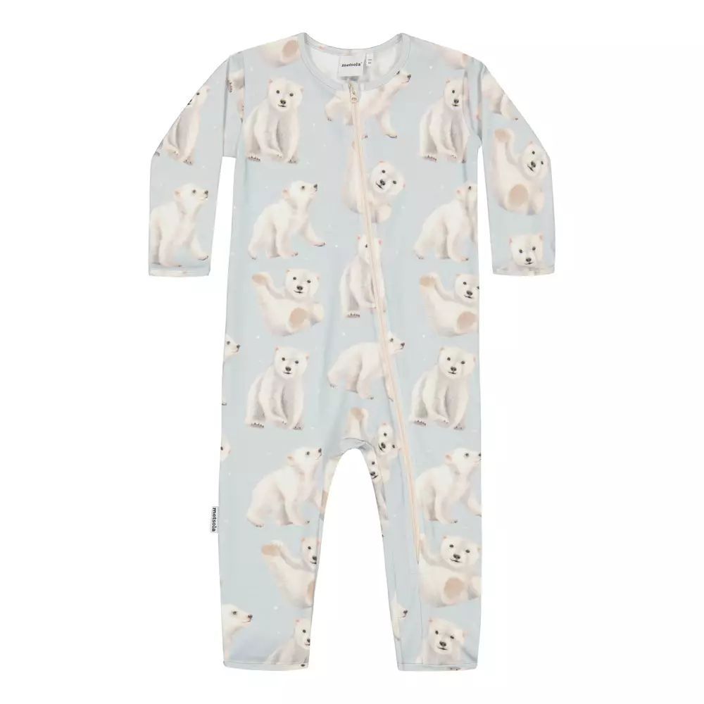 Polar Bears -Yöpuku värissä Icy Blue kietoo perheen pienimmät pakkaspäivän tunnelmaan. Tässä pitkävetoketjullisessa yöasussa suloinen jääkarhukuosi ja laadukas luomupuuvilla yhdistyvät käytännöllisyyteen ja estetiikkaan. Kuosin on suunnitellut Henna Adel, ja se on osa Metsolan lempeää Under the Same Moon -mallistoa.