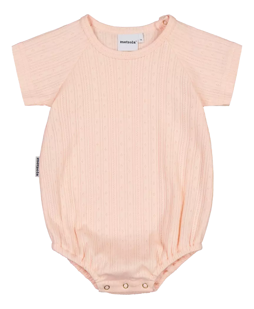 Romperin Milky Apricot -sävy on lämmin ja ajaton, helposti yhdisteltävä sävy arkeen ja juhlaan. Mukava väljä istuvuus antaa tilaa liikkua, ja käytännöllinen nepparikiinnitys haarassa tekee pukemisesta ja vaipanvaihdosta vaivatonta.