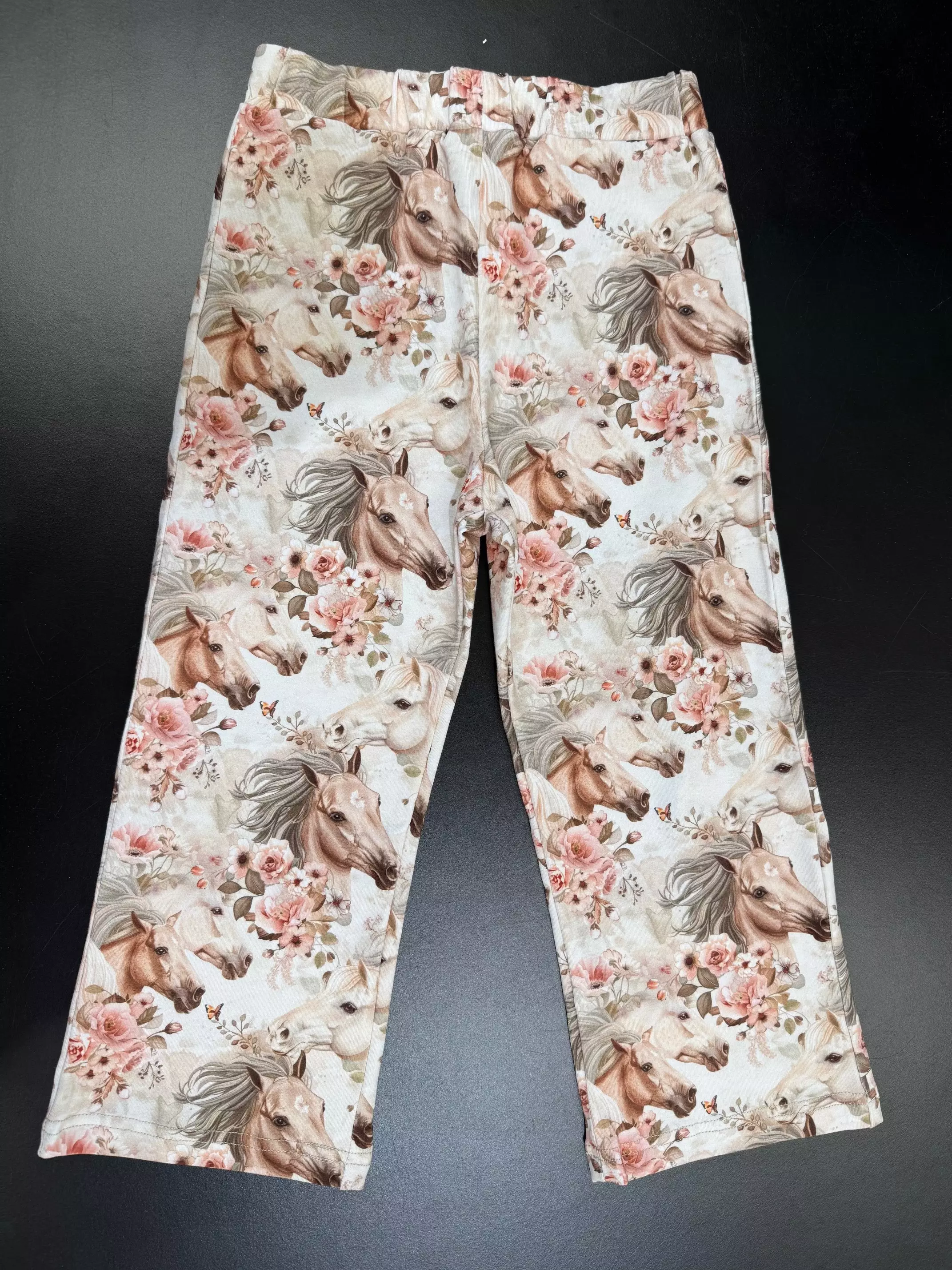 Ihastuttava lasten trikoohousut kauniissa hevoskuosissa. Vyötäröllä kuminauha.