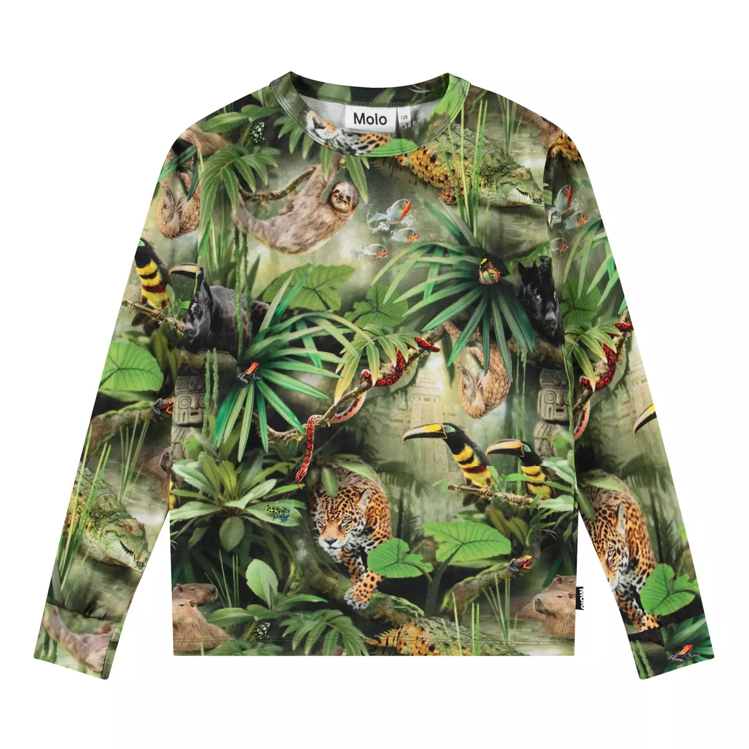Lasten pitkähihainen paita viidakko-kuosilla. Paidassa on väljä istuvuus ja se on valmistettu pehmeästä luomupuuvillasta.