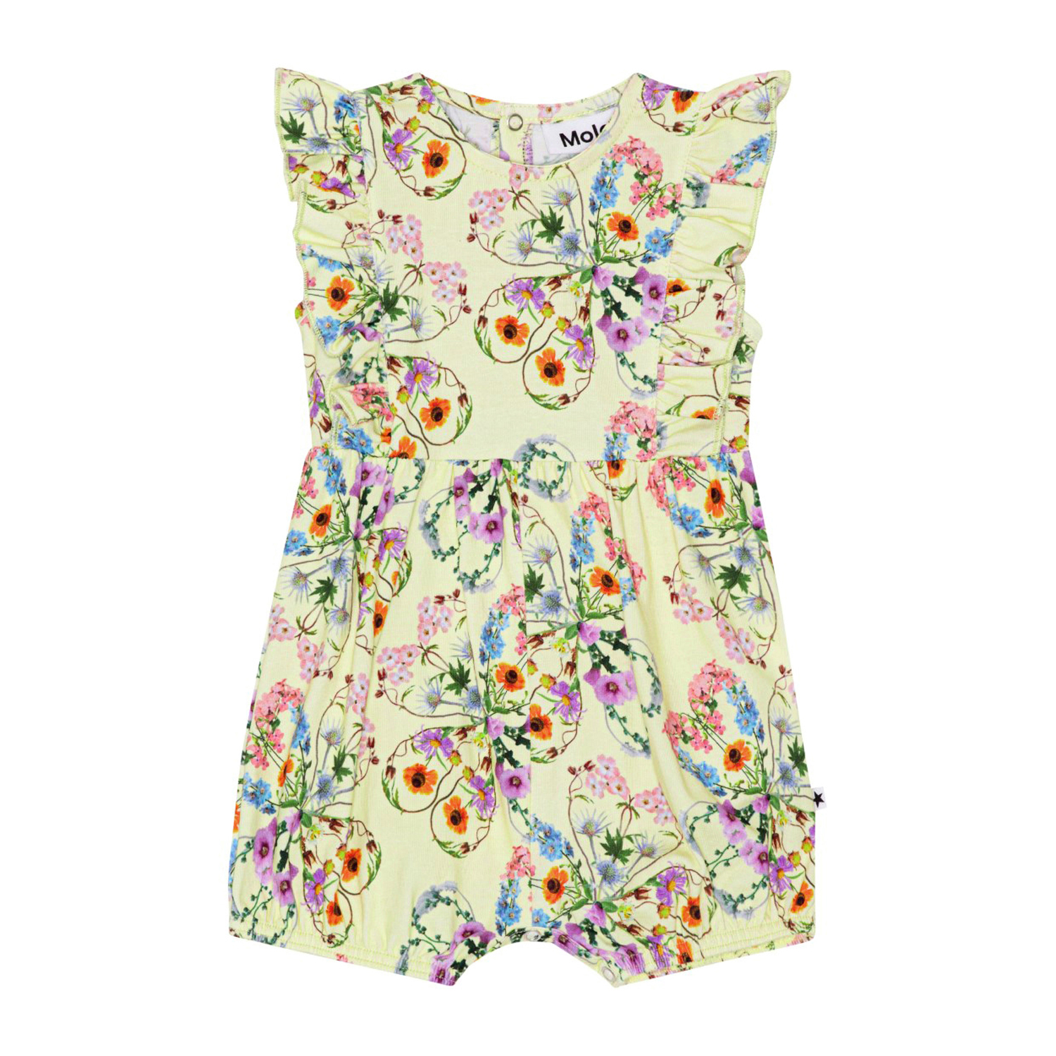 Lasten kesähaalari jossa keltaisella pohjalla kauniita kukkia. 95% luomupuuvillaa, 5% elastaania