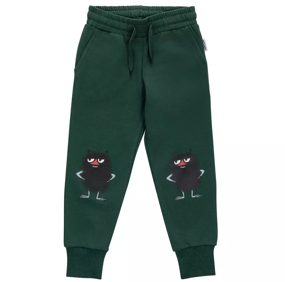 Vihreät Muumi-mallistoomme kuuluvat lasten pitkälahkeiset collegehousut, joissa on joustava vyötärö kiristysnauhalla, resorit lahkeensuissa, taskut ja pehmeäksi harjattu sisäpuoli. Molemmissa polvissa on hauskat printit Haisulista.