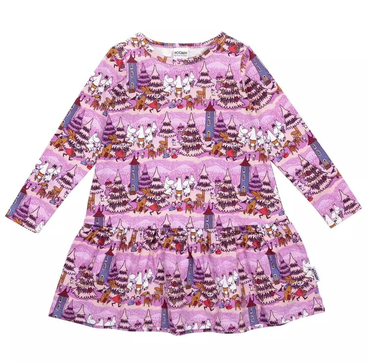 Hurmaavan pinkkipohjainen Muumi-mallistoomme kuuluva lasten pitkähihainen mekko, jossa on taskut, helmassa leveä frilla sekä A-linjainen leikkaus. Mekossa on monivärinen Pihajuhla-kuosi, jossa Muumilaakson väki iloitsee yhdessäolosta.
