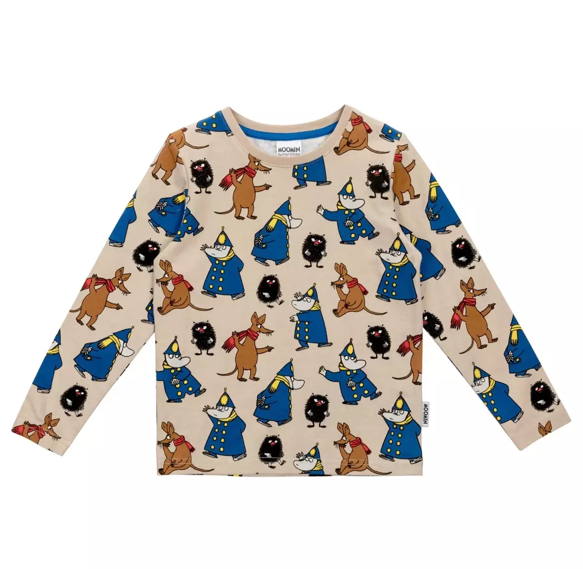 Lempeän beigepohjainen Muumi-mallistoomme kuuluva lasten pitkähihainen paita, jossa on suora malli. Paidassa on selkeä Ponteva-kuosi, jossa on suuria kuvia Muumilaakson asukkaista.