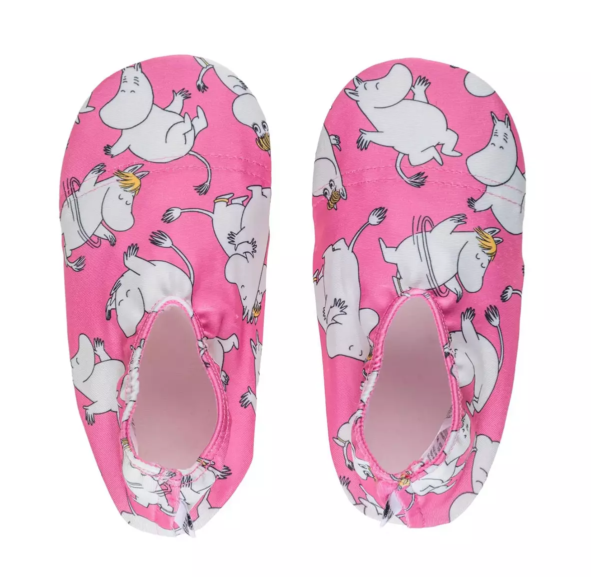 Herkullisen vaaleanpunaiset lasten liukuestetossut, joiden päällinen on valmistettu samasta materiaalista kuin uimapuvutkin. Monikäyttöiset tossut sopivat uimiseen rannalla tai uimahallissa sekä kerhotossuiksi ja sisäkäyttöön. Tossujen kauniin vaaleanpunaisella pohjalla on ihania kuvia Muumipeikosta ja Niiskuneidistä, Muumilaakson kyyhkyläisistä.