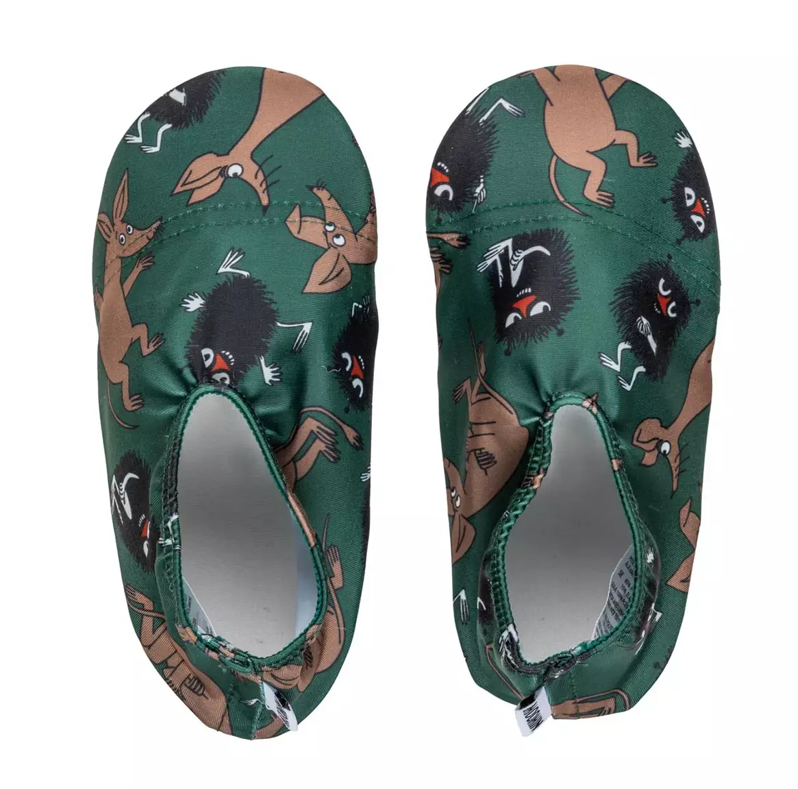 Metsänvihreät lasten liukuestetossut, joiden päällinen on valmistettu samasta materiaalista kuin uimapuvutkin. Monikäyttöiset tossut sopivat uimiseen rannalla tai uimahallissa sekä kerhotossuiksi ja sisäkäyttöön. Tossuissa on Haisulin ja Nipsun kuvia.