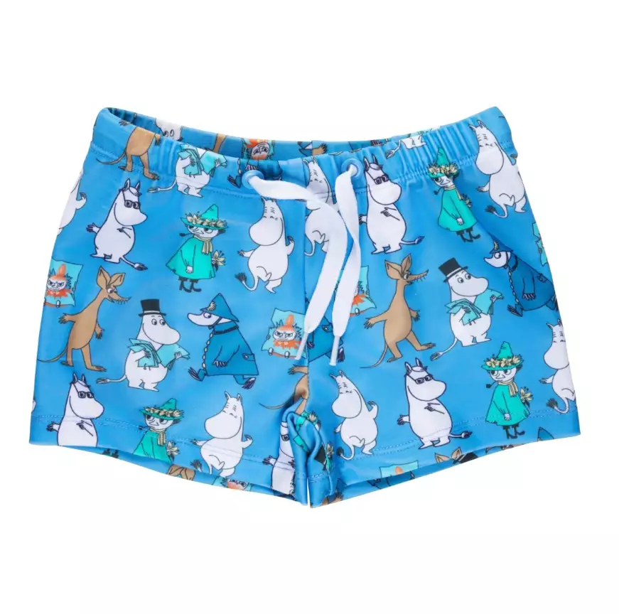 Kauniin siniset lasten uimahousut, joissa on kuminauhavyötärö, kiristysnauhat ja vuori. Uimahousujen selkeässä kuosissa esiintyy Muumilaakson poikasakki: Muumipeikko, Muumipappa, Nipsu, Niisku, Nuuskamuikkunen ja Poliisimestari. Myös Pikku Myy on saapunut paikalle ystäviään tervehtimään. Iloa rantaleikkeihin taikka uima-altaassa polskutteluun!