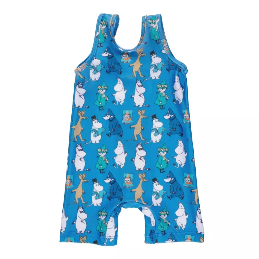 Raikkaasininen vauvojen uimapuku, jossa on leveät olkaimet ja lyhyet lahkeet. Uimapuvun olkaimet pitävät puvun hyvin yllä. Uimapuvun kuosissa esiintyy Muumilaakson poikasakki: Muumipeikko, Muumipappa, Nipsu, Niisku, Nuuskamuikkunen ja Poliisimestari. Myös Pikku Myy on saapunut paikalle ystäviään tervehtimään.