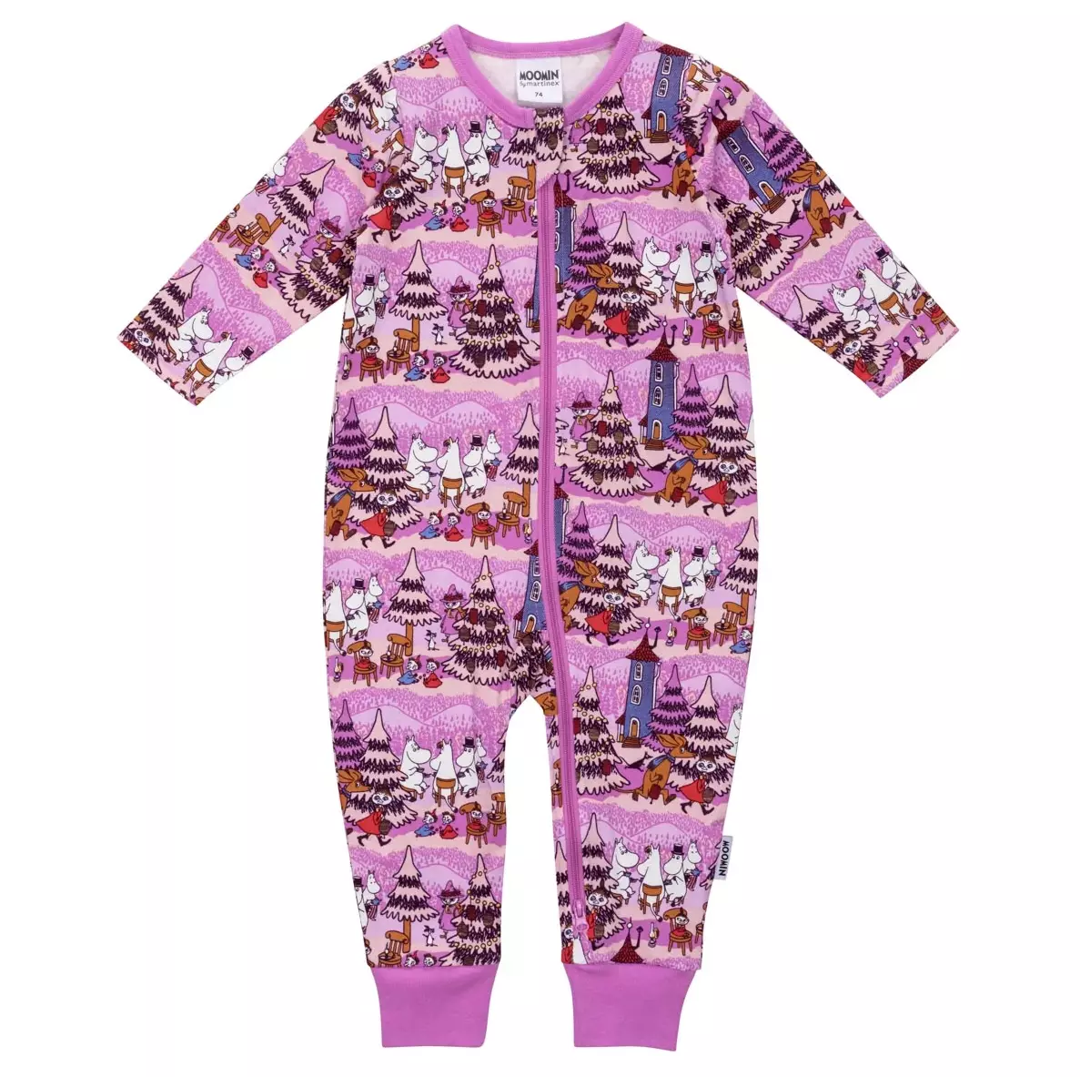 Hurmaavan pinkkipohjainen Muumi-mallistoomme kuuluva vauvojen pitkähihainen pyjama, jossa on kaksisuuntainen vetoketju. Muumi-yöpuvussa on monivärinen Pihajuhla-kuosi, jossa Muumilaakson väki iloitsee yhdessäolosta.