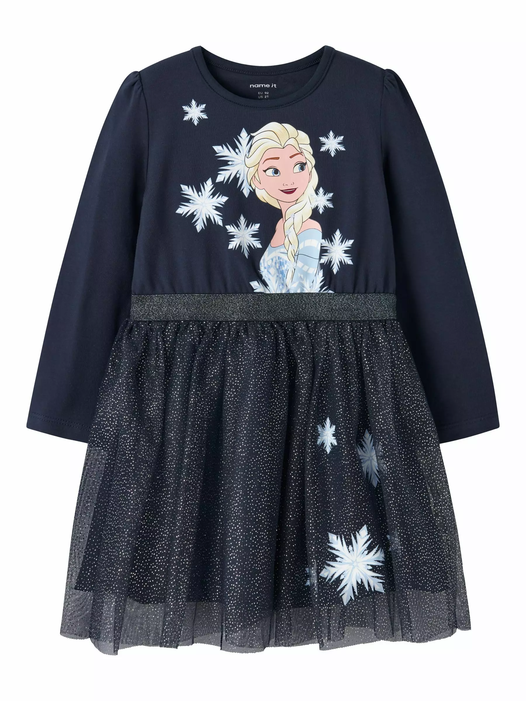 Sininen tyllihelmainen mekko Frozen kuvalla.
